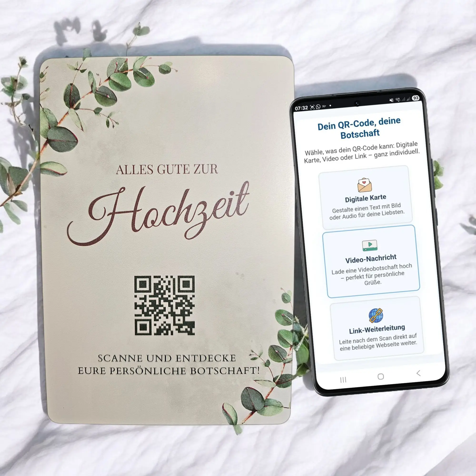 Diese exklusive Hochzeitskarte aus Metall ist mehr als ein klassischer Glückwunsch – sie verbindet modernes Design mit persönlicher Tiefe und einer digitalen Überraschung. Bedruckt auf hochwertigem Aluminium und ausgestattet mit einem individuellen QR-Code, wird daraus ein unvergessliches Geschenk für das Brautpaar.