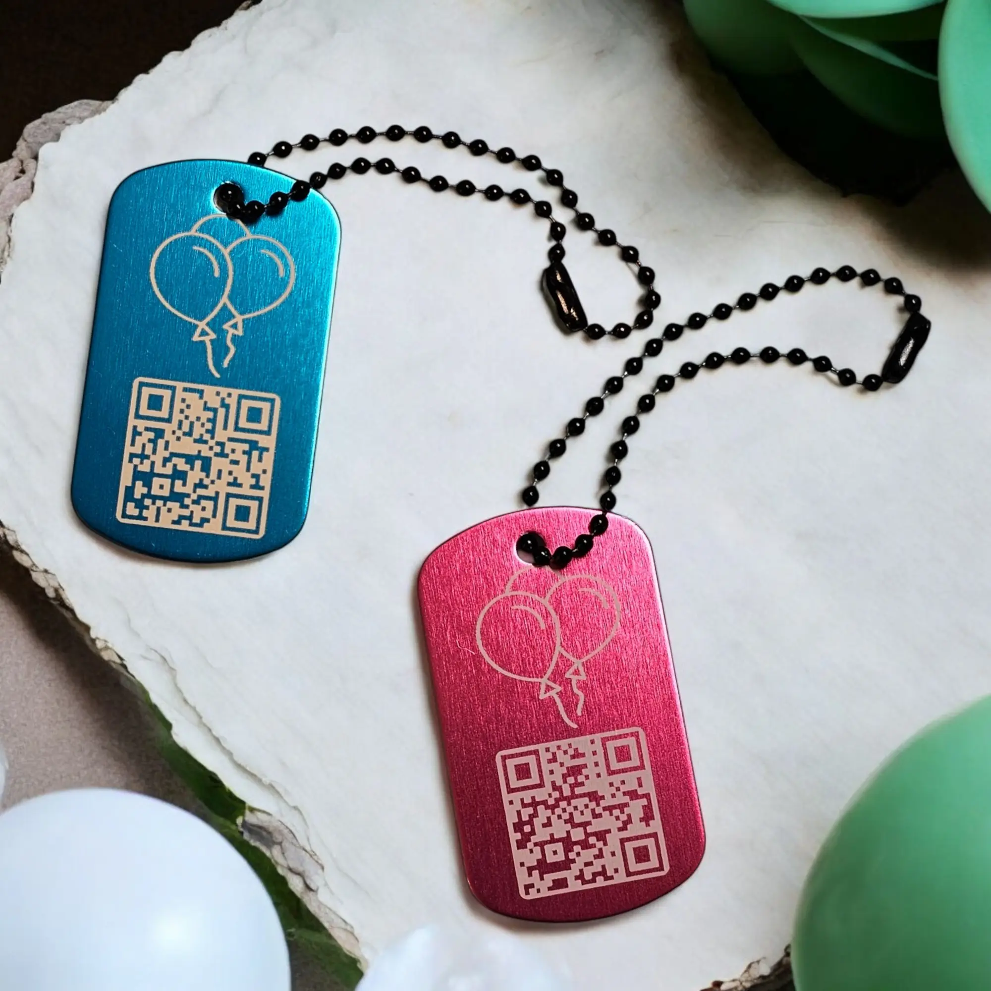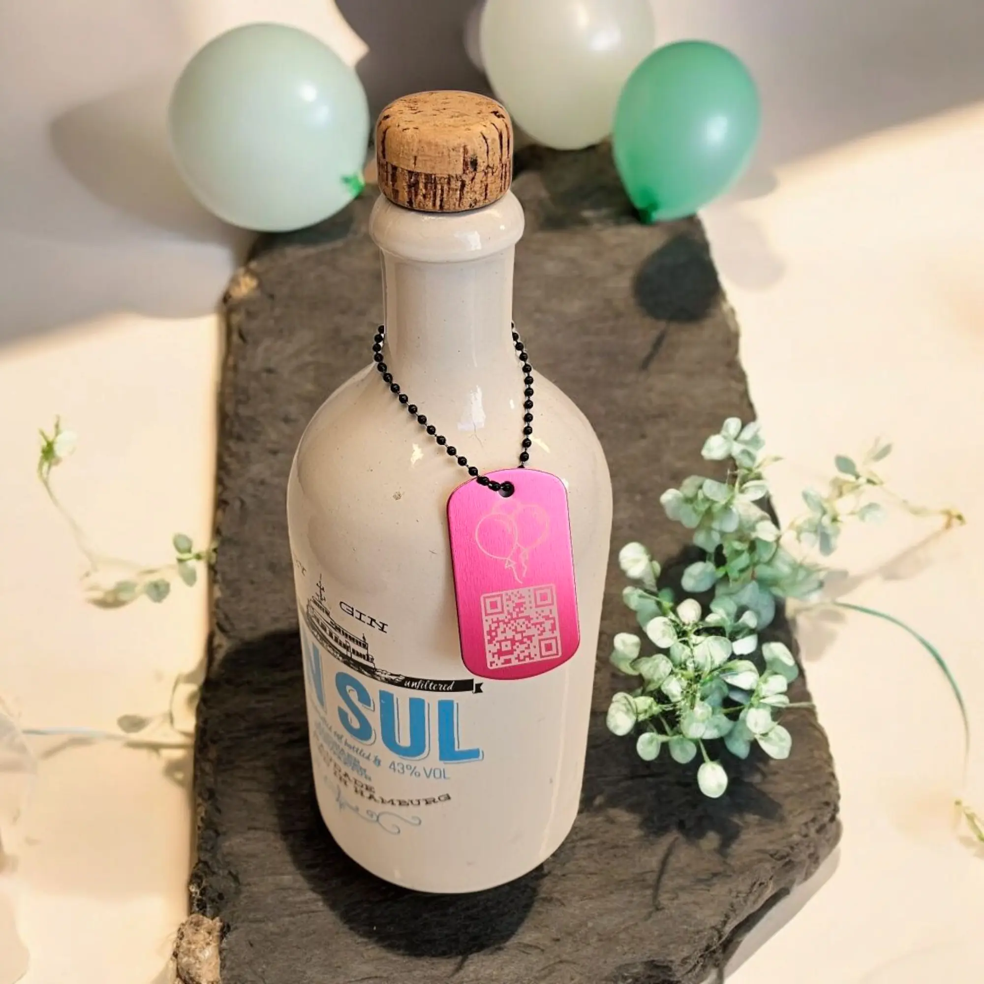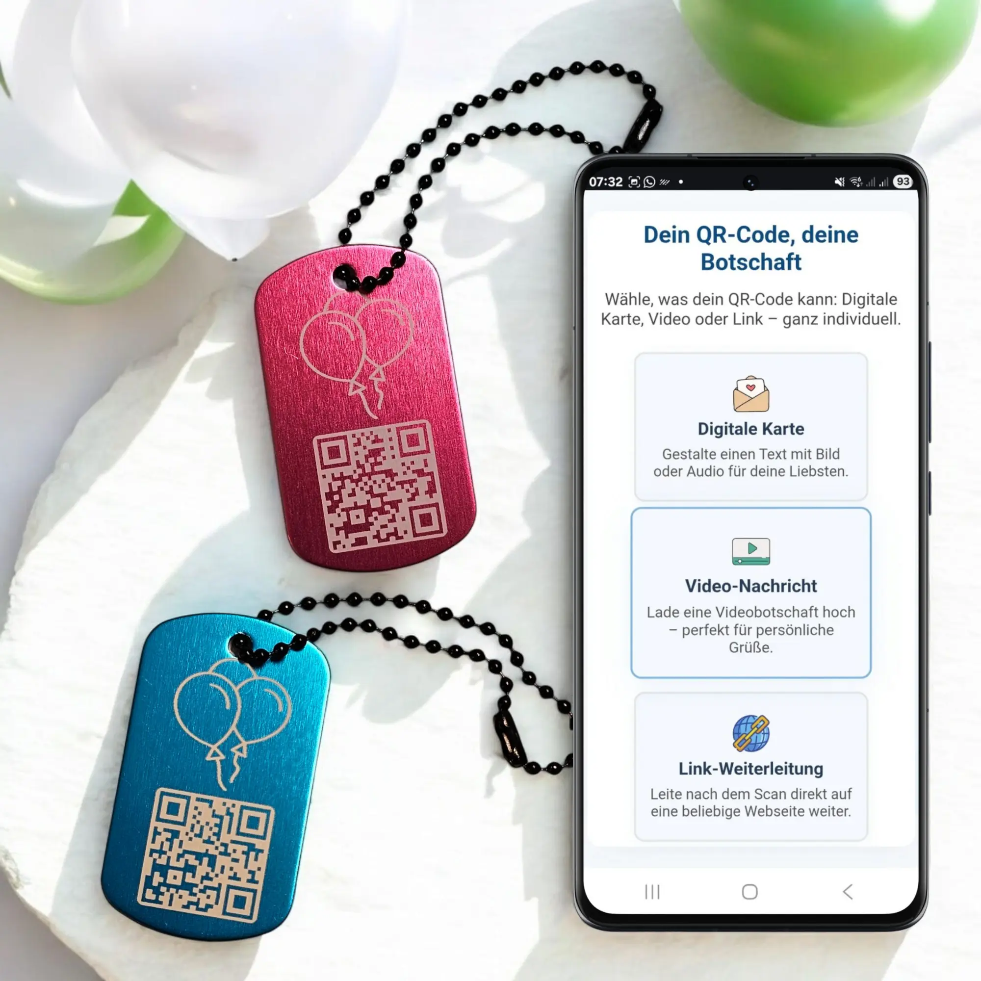- Individuelle Gravur: Jeder Anhänger wird mit einem personalisierten QR-Code und einem filigranen Ballon-Motiv versehen.