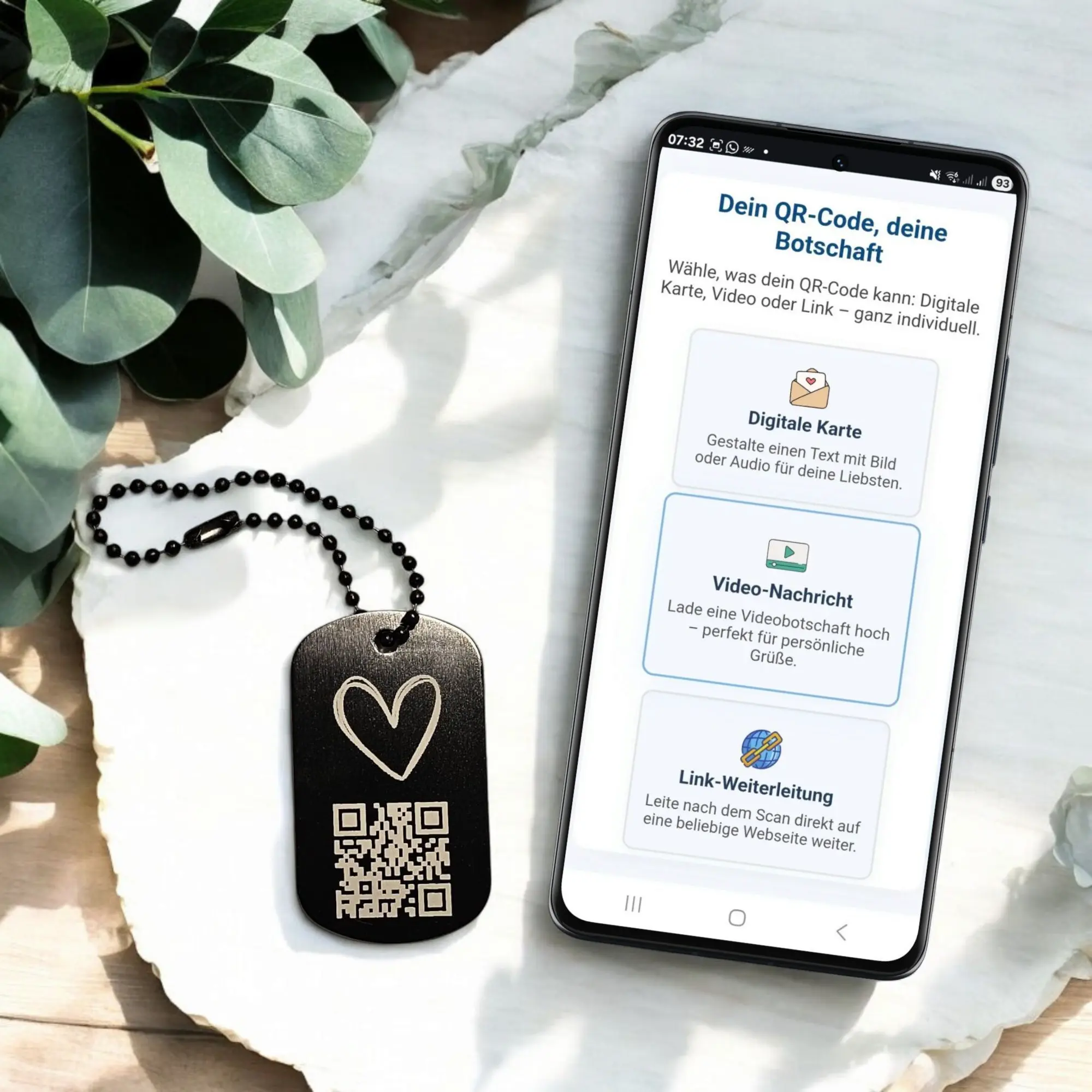 Mit deinem individuell gravierten QR-Code kannst du digitale Botschaften kreativ gestalten. Ob liebevolle Textnachricht, persönliche Audiogrüße oder eine emotionale Videobotschaft – du hast die Wahl. Jedes Scan-Erlebnis wird einzigartig und verleiht deinem Geschenk einen unvergesslichen Charakter.
