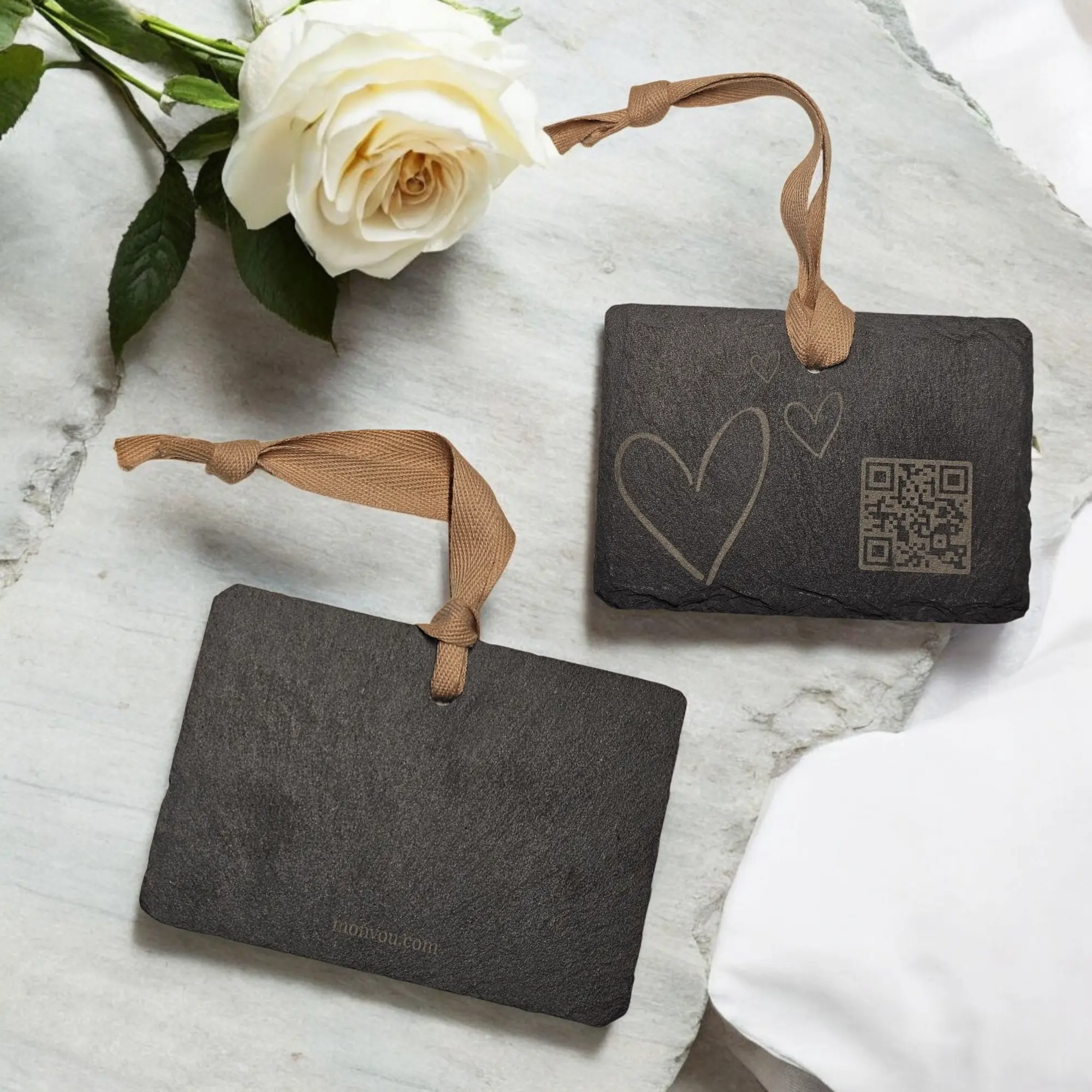 Nachhaltige Schiefertafel mit graviertem Herz und QR-Code – verbinde analoge Eleganz mit digitalen Botschaften (Foto, Video, Text).