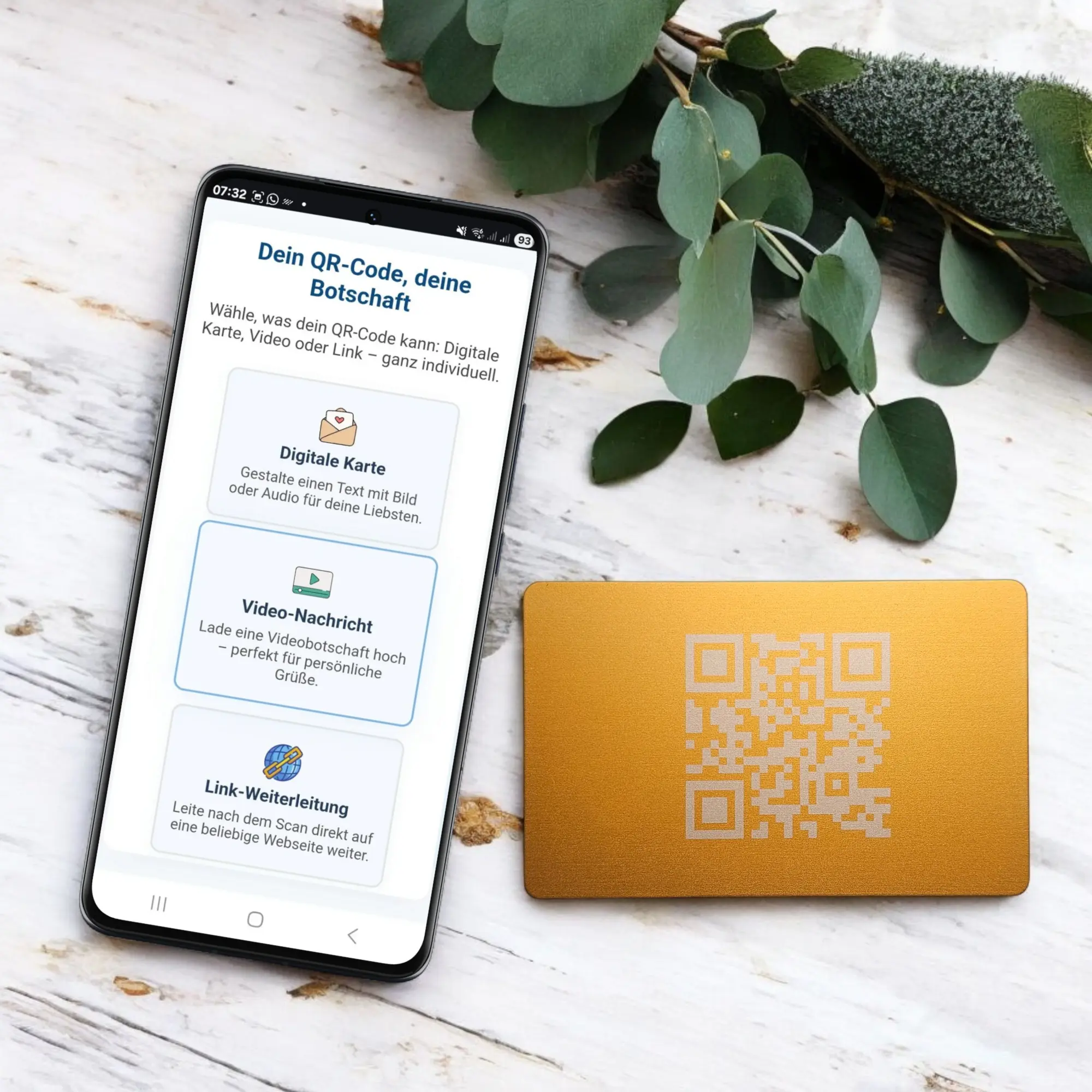Jede **Metallkarte mit QR-Code** wird mit einer präzisen Gravur versehen, die dauerhaft sichtbar ist. Der Code dient als Schlüssel zu einer persönlichen digitalen Botschaft, die du ganz individuell gestalten kannst. Du hast die volle Freiheit, dein Erlebnis zu personalisieren – wähle zwischen einer persönlichen Videobotschaft, einer Galerie mit Fotos und Audio, einer digitalen Grußkarte oder einer Link-Weiterleitung zu einer Webseite deiner Wahl (z.B. YouTube oder Spotify).